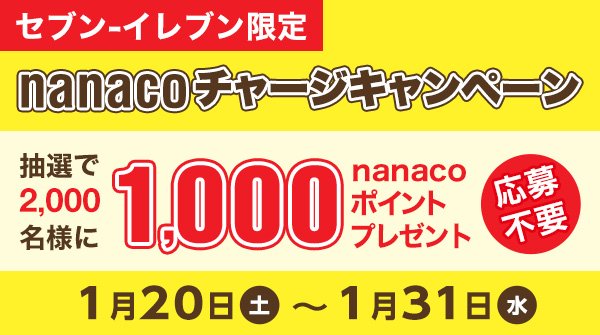 電子マネー Nanaco 公式 On Twitter セブン イレブン Nanacoチャージキャンペーン実施中 レジにて 1回3 000円以上現金でチャージされた方の中から 抽選で2 000名様に1 000pをプレゼント 詳しくは pc スマホ Https T Co Rzkzpwzuo6 Nanaco